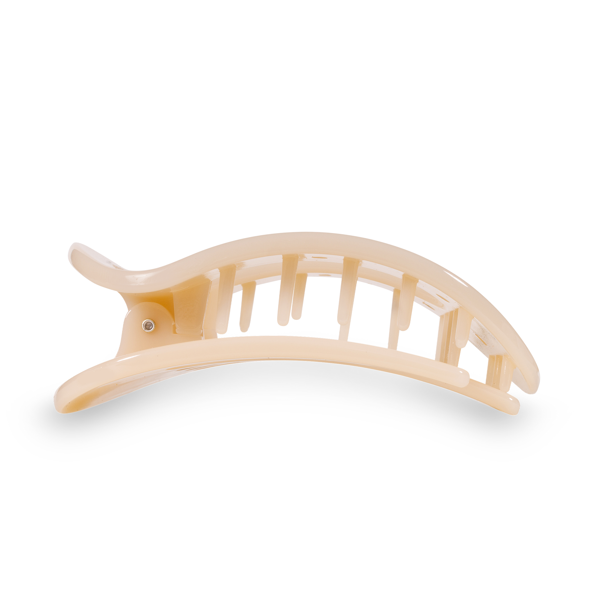 Lay flat and relax with the new TELETIES Almond Beige Large Flat Round Hair Clip in Beige. This hair clip is designed to allow you to lay back flat, do yoga, or sit comfortably in a seat with a headrest, and it is made with the same material that is nearly unbreakable. Lay down flat with comfort Bendable teeth for a secure yet gentle hold Lightweight, durable, and hair-friendly Perfect for all-day wear—from sunup to sundown The large size is great for thick hair. The large clip is 4.5 inches long. Sold as an individual unit.