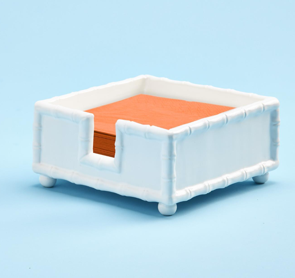 Keep napkins neat and orderly with this glazed ceramic Cocktail Napkin Holder. The Ceramic has been molded into the shape of Bamboo around the edges and features 4 round feet so it stands raised above your countertop.